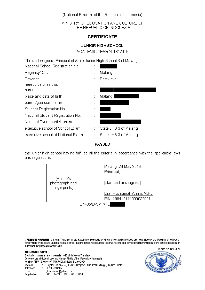 Jasa penerjemah tersumpah ijazah, transkrip nilai, SKHUN, rapor, piagam, sertifikat, kartu siswa, surat keterangan sehat, abtrak, skripsi, tesis, dll.